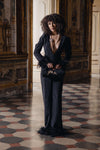 Tuta nera Cinzia in crêpe con piume