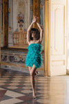 Il mini abito Krystyn in verde smeraldo è un inno alla leggerezza e alla femminilità. Totalmente rivestito di piume tono su tono, avvolge il corpo con volumi morbidi e un effetto tridimensionale scenografico.